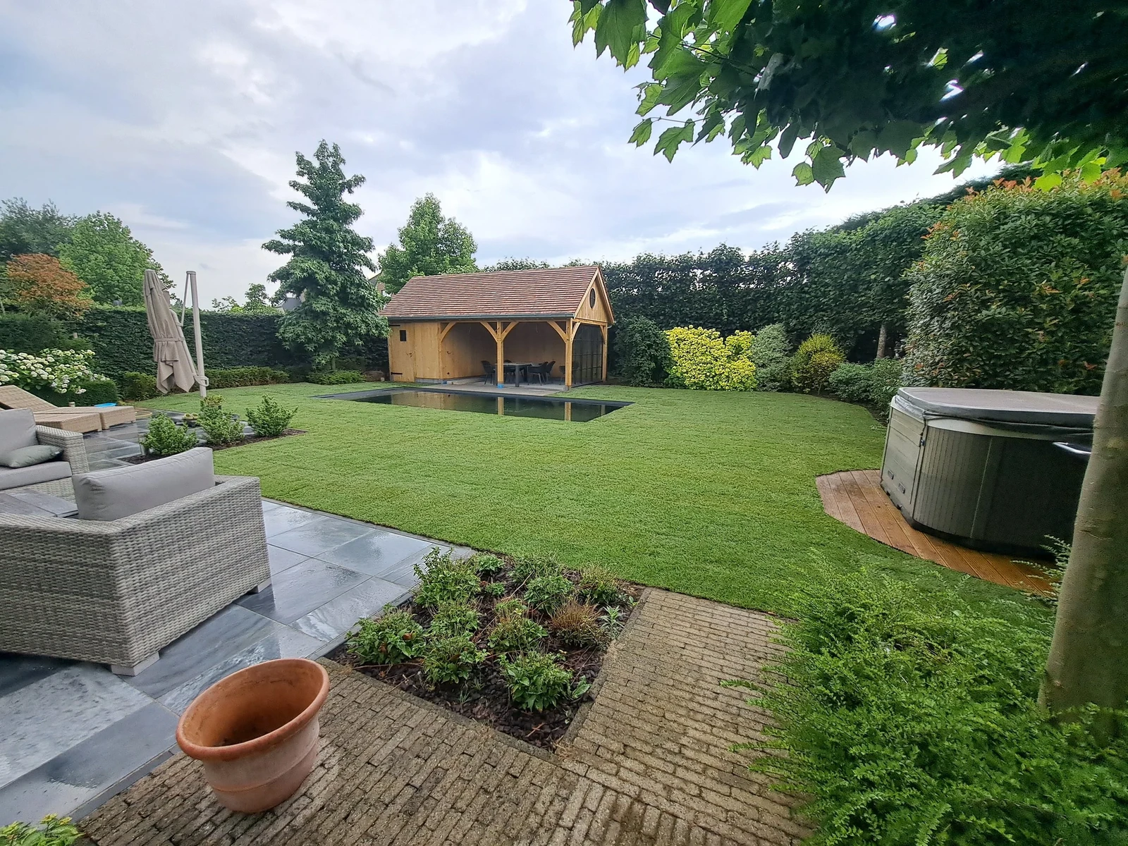 Deze klant heeft gedurende het afgelopen voorjaar uitgebreide verbouwingen in de tuin uitgevoerd. Na het eigenhandig bouwen van een nieuw tuinhuis/poolhouse, werd tevens een zwemvijver aangelegd.
