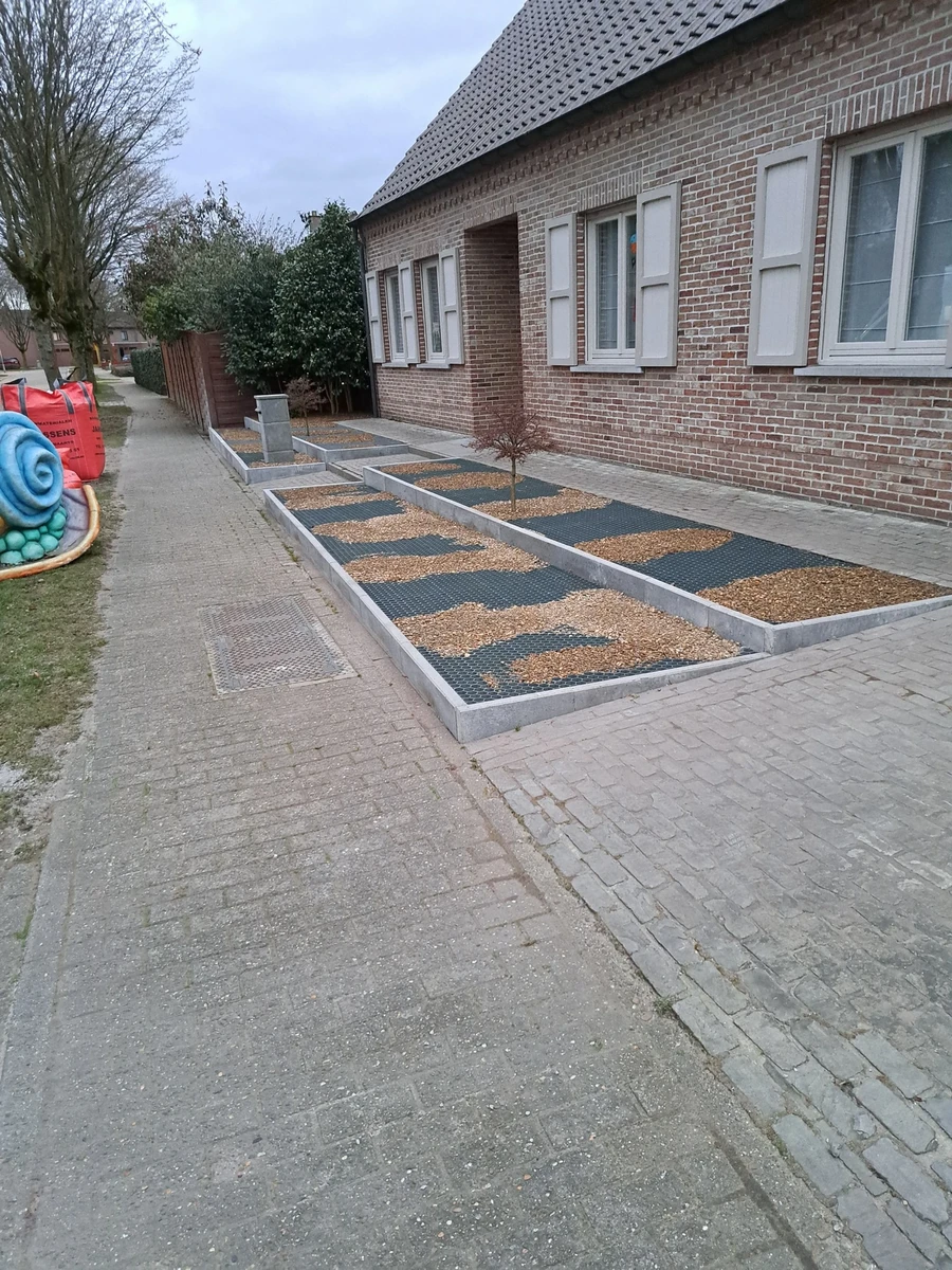 Er werd gekozen om te werken met 2 verschillende hoogtes zodat voorbijgangers zich niet zouden bezeren aan de hoge boordstenen. Deze kleine verhoging tegen de straatzijde zorgt er ook voor dat zwerfvuil vanop straat minder snel bij de klant aan de voordeur kan komen aanwaaien.